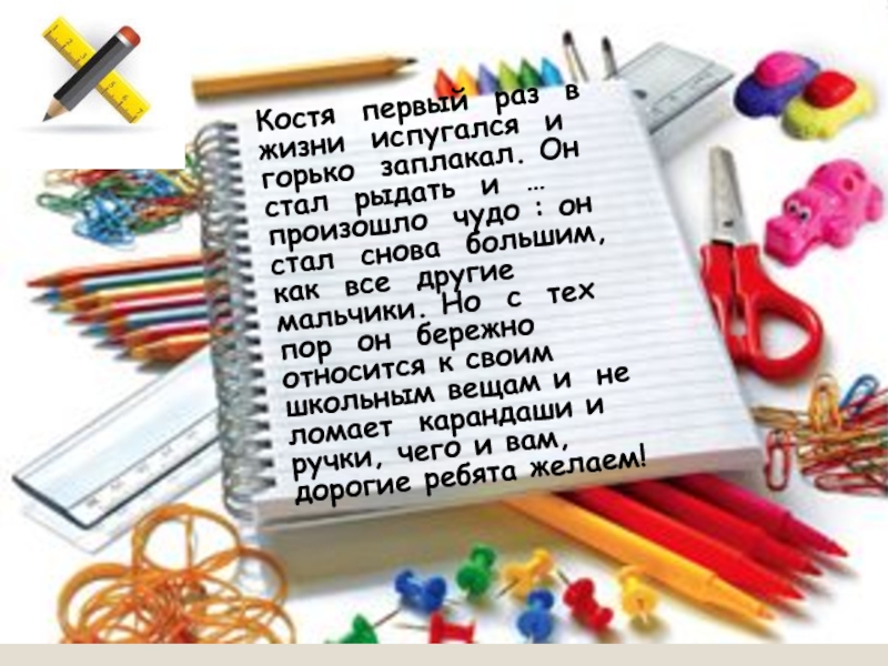 рыдать и … произошло чудо : он стал снова большим, как все другие мальчики. Но с тех пор он бережно относится к своим школьным вещам и не ломает карандаши и ручки, чего и вам, дорогие ребята желаем!