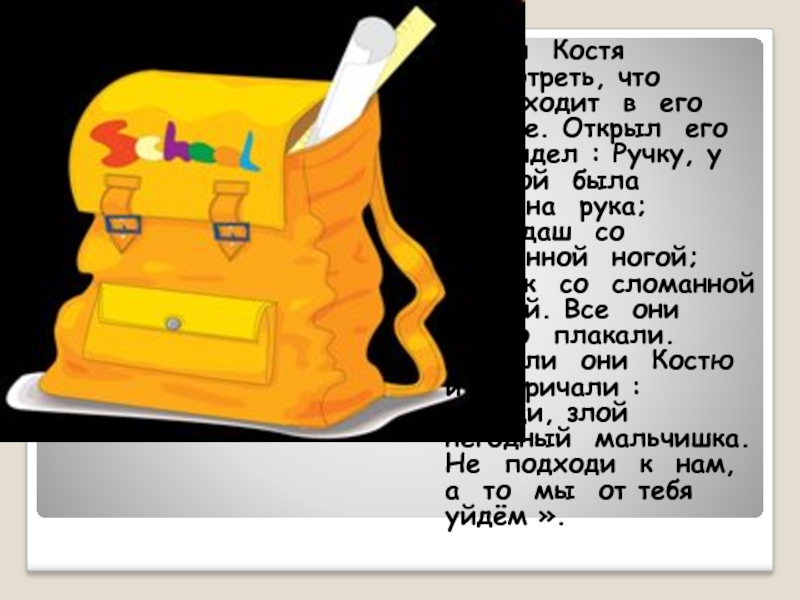 увидел : Ручку, у которой была сломана рука; Карандаш со сломанной ногой; Ластик со сломанной спиной. Все они горько плакали. Увидели они Костю и закричали : «Уходи, злой негодный мальчишка. Не подходи к нам, а то мы от тебя уйдём ».