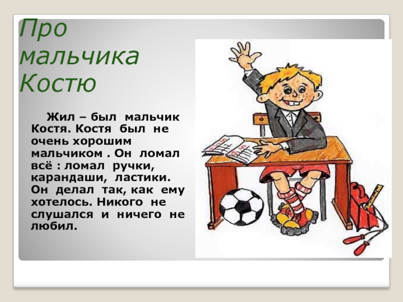 ПромальчикаКостю Жил – был мальчик Костя. Костя был не очень хорошим мальчиком . Он ломал всё : ломал ручки, карандаши, ластики. Он делал так, как ему хотелось. Никого не слушался и ничего не
