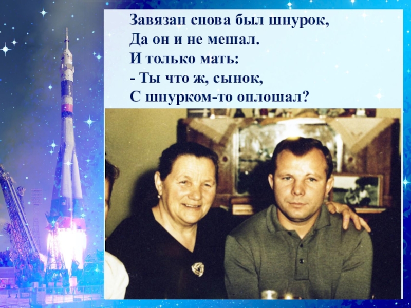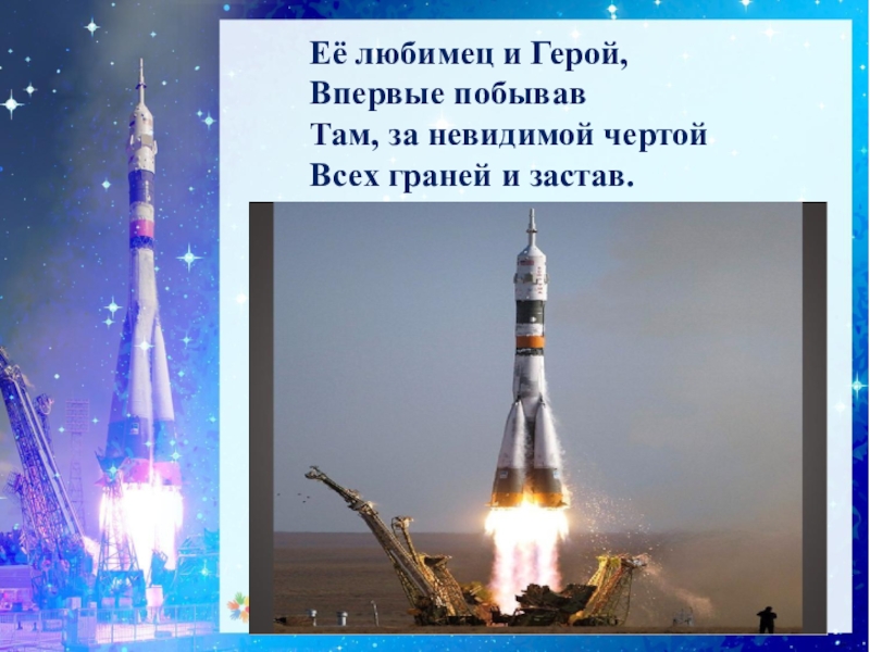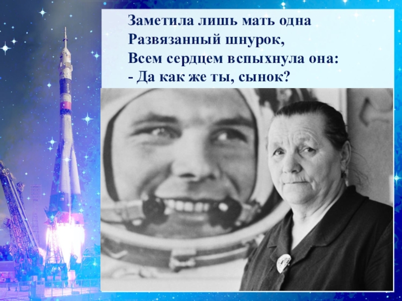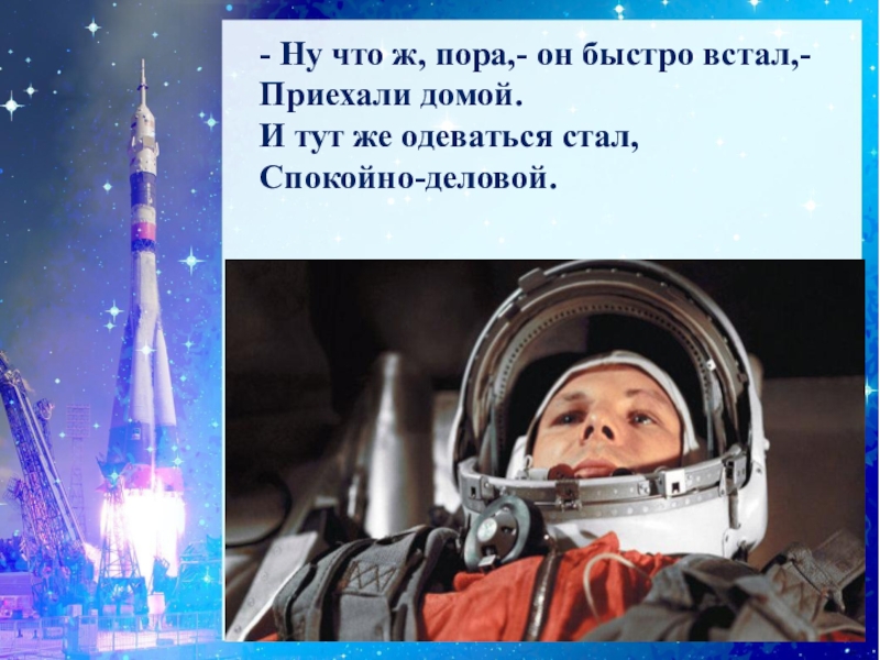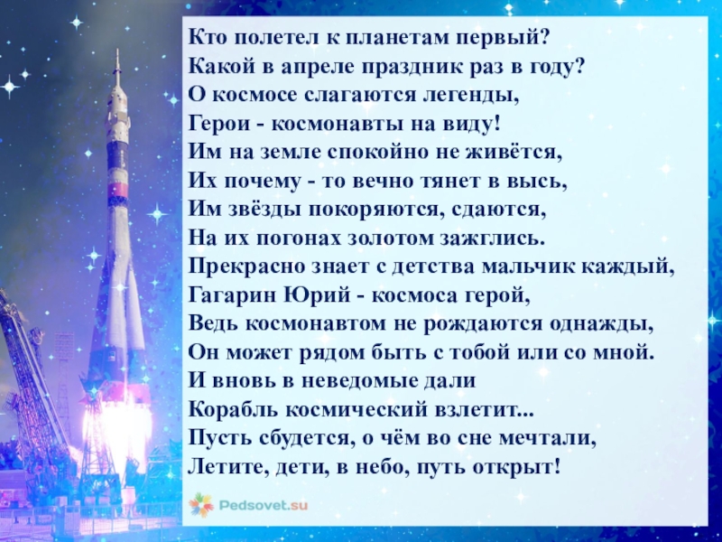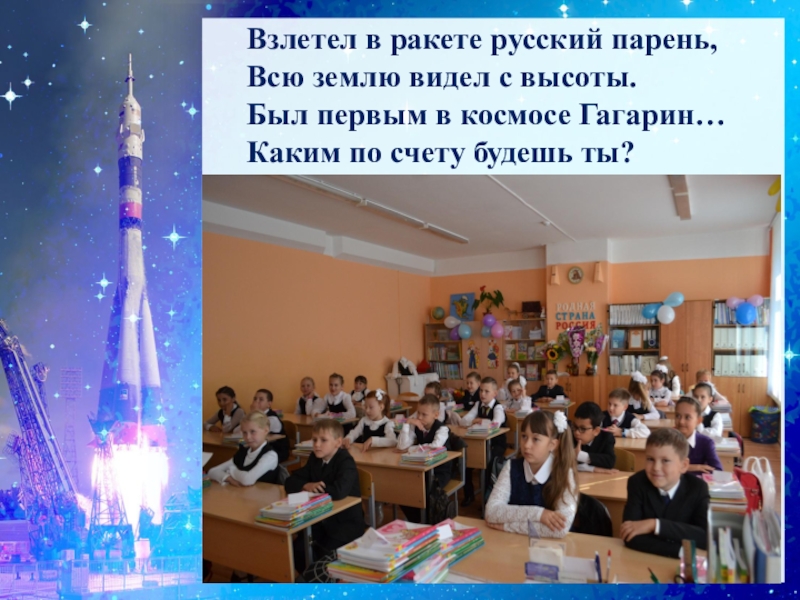 Взлетел в ракете русский парень,Всю землю видел с высоты.Был первым в космосе Гагарин…Каким по счету будешь ты?