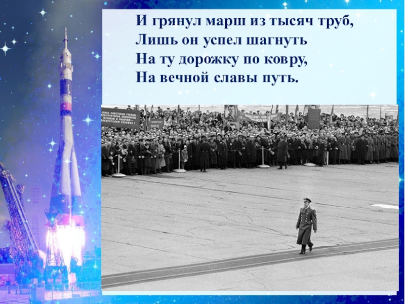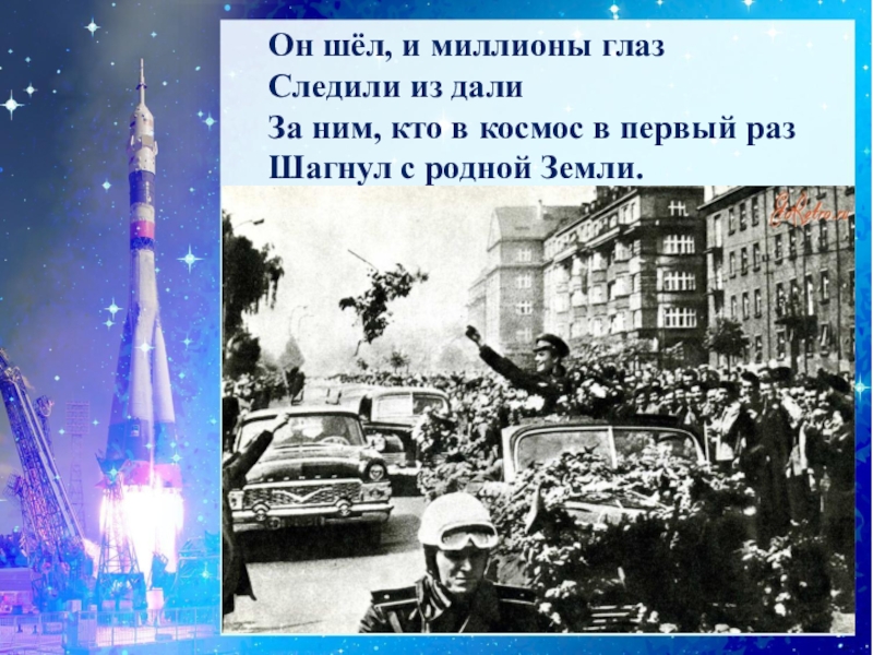 Он шёл, и миллионы глазСледили из далиЗа ним, кто в космос в первый разШагнул с родной Земли.