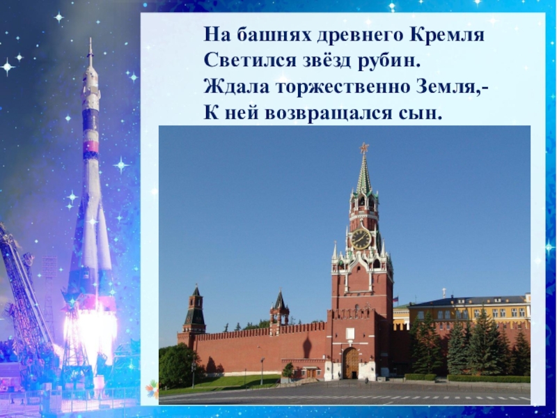 На башнях древнего КремляСветился звёзд рубин.Ждала торжественно Земля,-К ней возвращался сын.