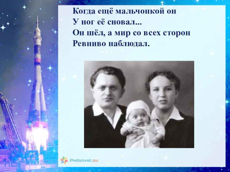 Когда ещё мальчонкой онУ ног её сновал...Он шёл, а мир со всех сторонРевниво наблюдал.