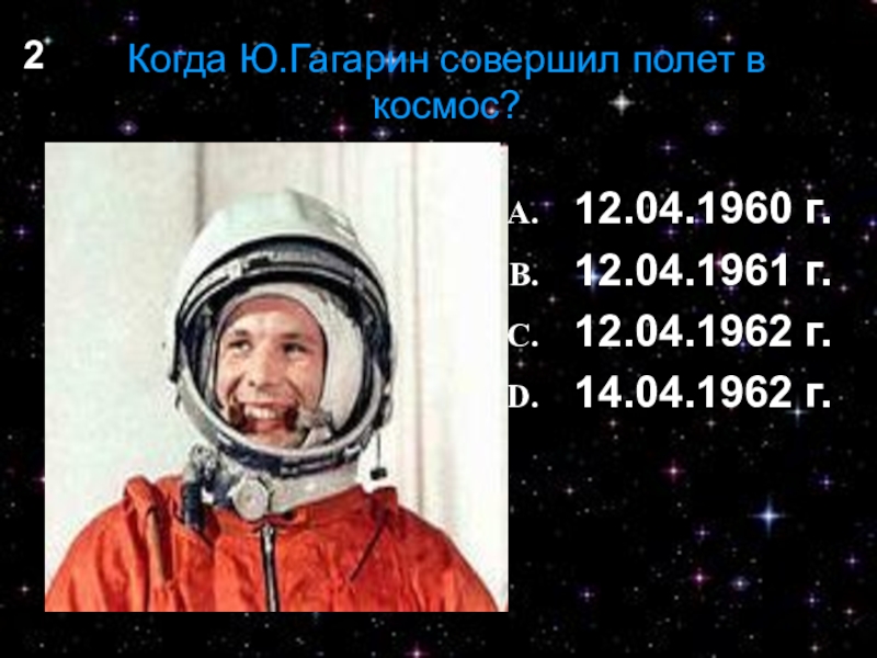 Когда Ю.Гагарин совершил полет в космос?12.04.1960 г.12.04.1961 г.12.04.1962 г.14.04.1962 г.2