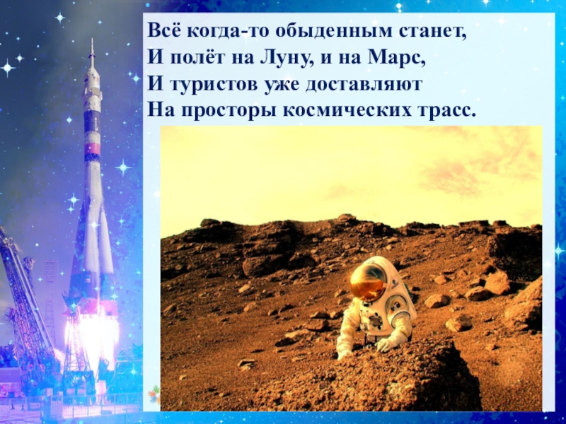 Всё когда-то обыденным станет,И полёт на Луну, и на Марс,И туристов уже доставляютНа просторы космических трасс.