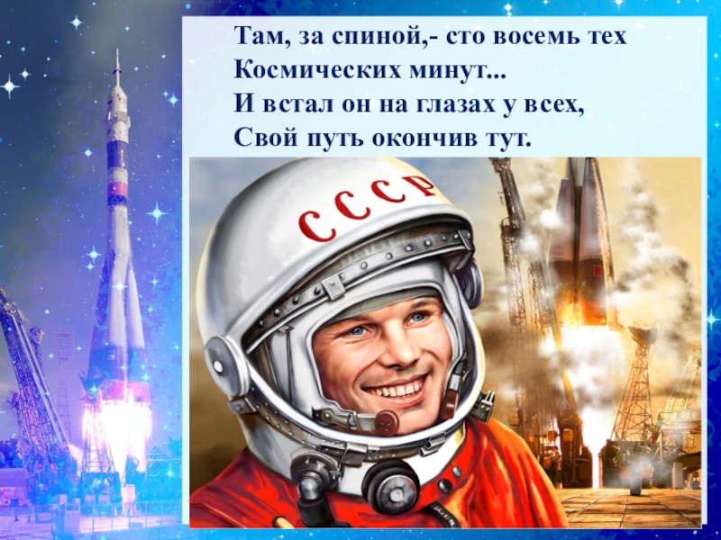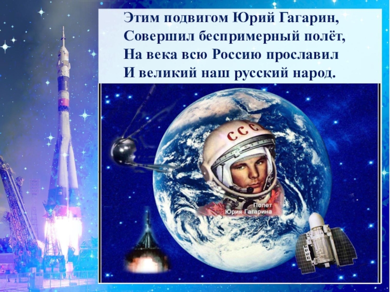 Этим подвигом Юрий Гагарин,Совершил беспримерный полёт,На века всю Россию прославилИ великий наш русский народ.