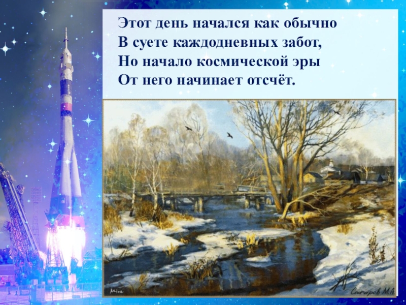 Этот день начался как обычноВ суете каждодневных забот,Но начало космической эрыОт него начинает отсчёт.