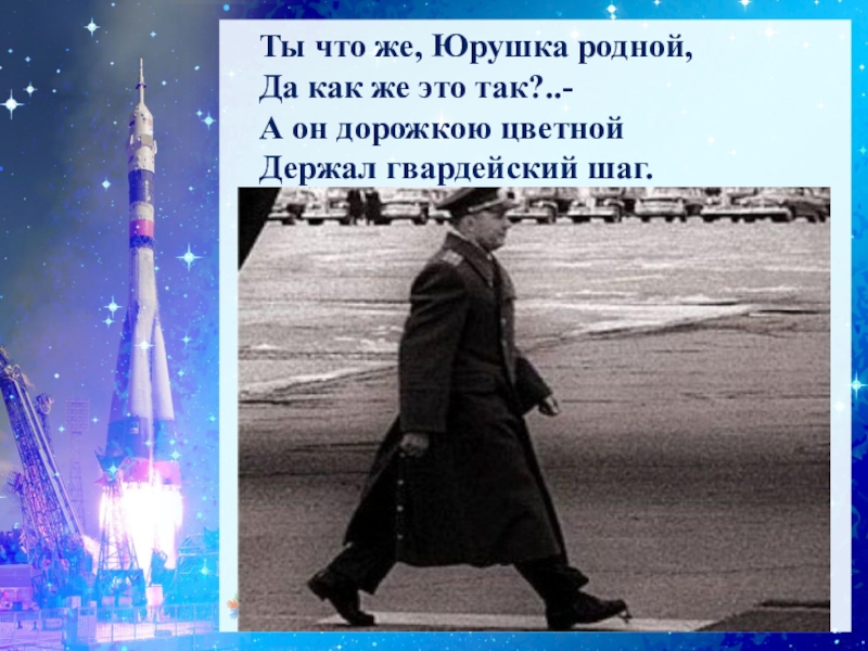 Ты что же, Юрушка родной,Да как же это так?..-А он дорожкою цветнойДержал гвардейский шаг.