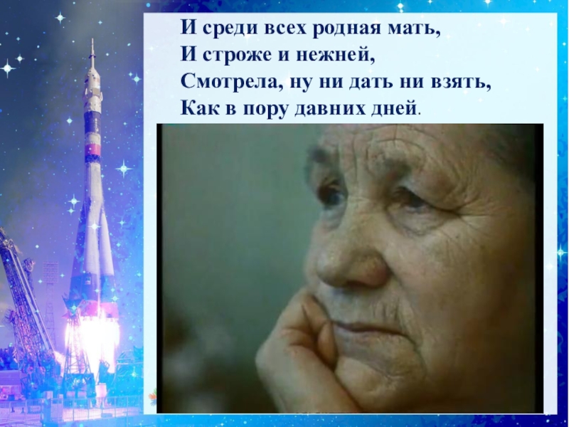 И среди всех родная мать,И строже и нежней,Смотрела, ну ни дать ни взять,Как в пору давних дней.