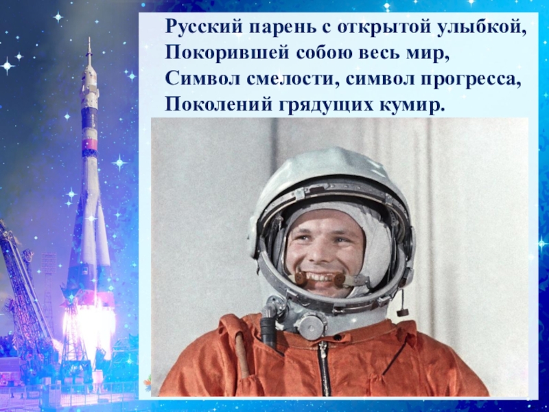 Русский парень с открытой улыбкой,Покорившей собою весь мир,Символ смелости, символ прогресса,Поколений грядущих кумир.