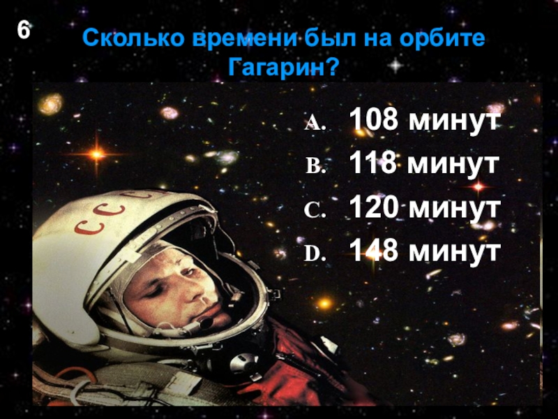 Сколько времени был на орбите Гагарин?108 минут118 минут120 минут148 минут6
