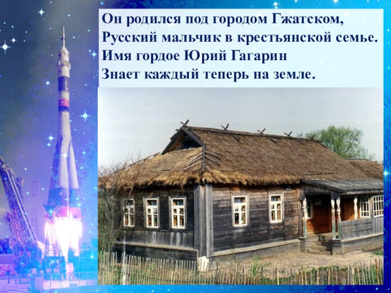 Он родился под городом Гжатском,Русский мальчик в крестьянской семье.Имя гордое Юрий ГагаринЗнает каждый теперь на земле.