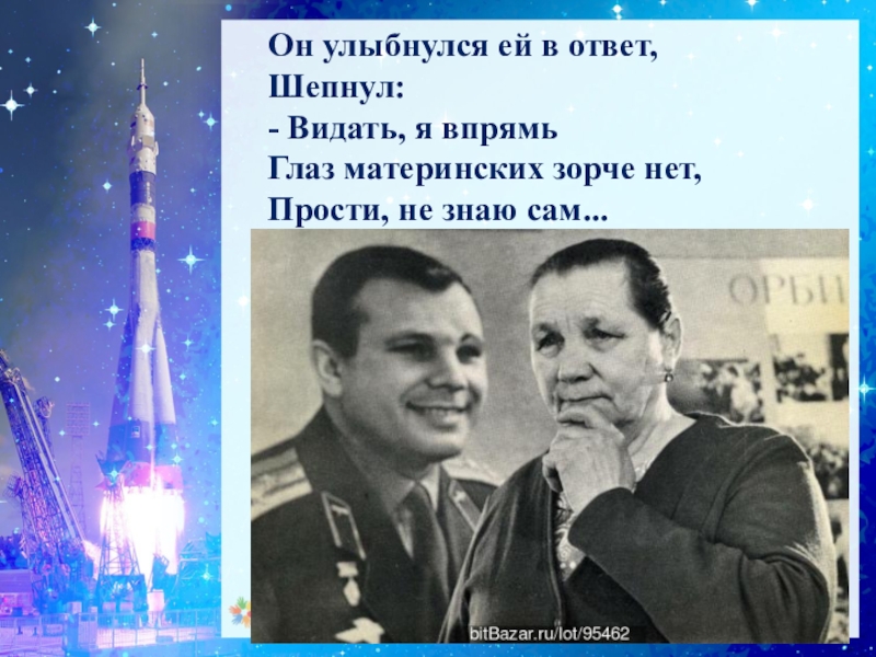Так, мать улыбкой веселя,Был счастлив человек,И ту улыбку вся ЗемляЗапомнила навек.