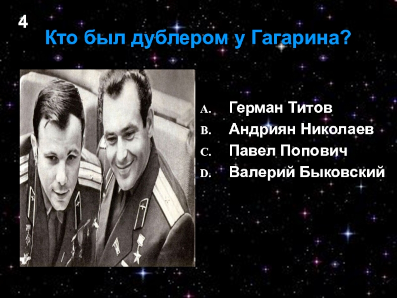 Кто был дублером у Гагарина?Герман ТитовАндриян НиколаевПавел ПоповичВалерий Быковский4