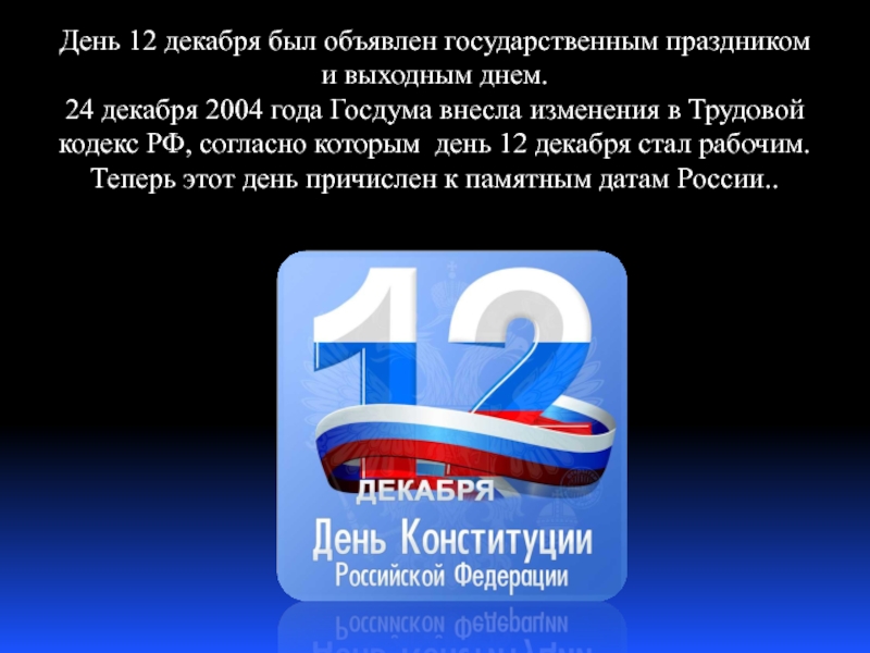 2004 года Госдума внесла изменения в Трудовой кодекс РФ, согласно которым день 12 декабря стал рабочим. Теперь этот день причислен к памятным датам России..