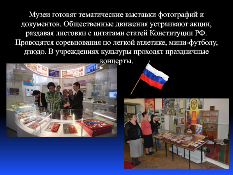 раздавая листовки с цитатами статей Конституции РФ. Проводятся соревнования по легкой атлетике, мини-футболу, дзюдо. В учреждениях культуры проходят праздничные концерты.