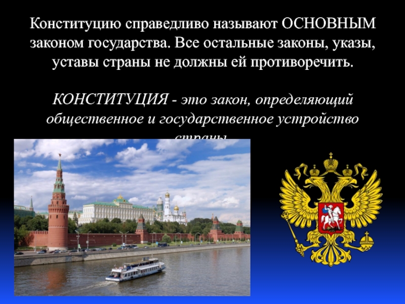 Слайд 12Конституцию справедливо называют ОСНОВНЫМ законом государства. Все остальные законы, указы, уставы