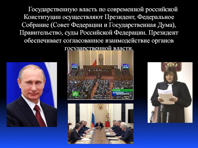 Слайд 11 Государственную власть по современной российской Конституции осуществляют Президент,
