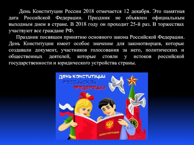 Слайд 3 День Конституции России 2018 отмечается 12 декабря. Это