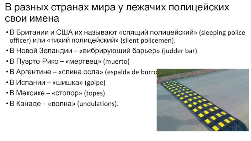 Слайд 4В разных странах мира у лежачих полицейских свои имена