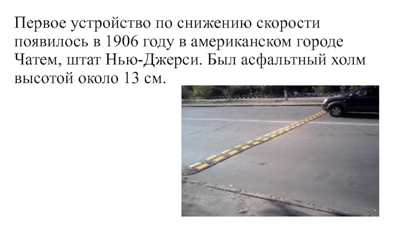 Первое устройство по снижению скорости появилось в 1906 году в американском городе Чатем, штат Нью-Джерси. Был асфальтный