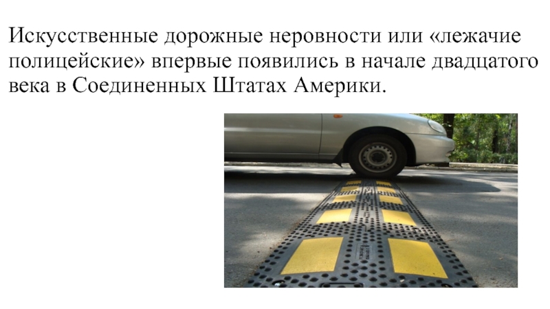 Слайд 2Искусственные дорожные неровности или «лежачие полицейские» впервые появились в начале двадцатого