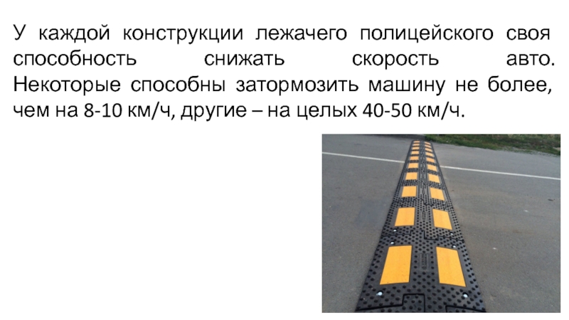 Слайд 5У каждой конструкции лежачего полицейского своя способность снижать скорость авто. Некоторые способны