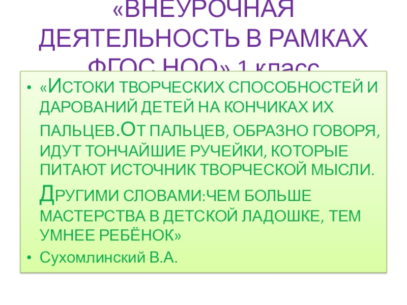 ДАРОВАНИЙ ДЕТЕЙ НА КОНЧИКАХ ИХ ПАЛЬЦЕВ.ОТ ПАЛЬЦЕВ, ОБРАЗНО ГОВОРЯ,ИДУТ ТОНЧАЙШИЕ РУЧЕЙКИ, КОТОРЫЕ ПИТАЮТ ИСТОЧНИК ТВОРЧЕСКОЙ МЫСЛИ. ДРУГИМИ СЛОВАМИ:ЧЕМ БОЛЬШЕ МАСТЕРСТВА В ДЕТСКОЙ ЛАДОШКЕ, ТЕМ УМНЕЕ РЕБЁНОК»