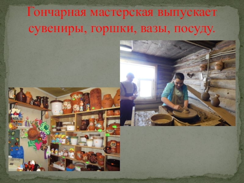 Слайд 5Гончарная мастерская выпускает сувениры, горшки, вазы, посуду.