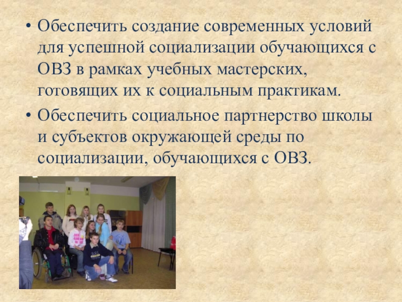 Слайд 12Обеспечить создание современных условий для успешной социализации обучающихся с ОВЗ в