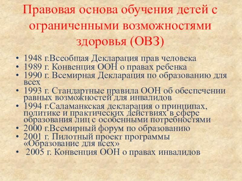 Слайд 3Правовая основа обучения детей с ограниченными возможностями здоровья (ОВЗ)