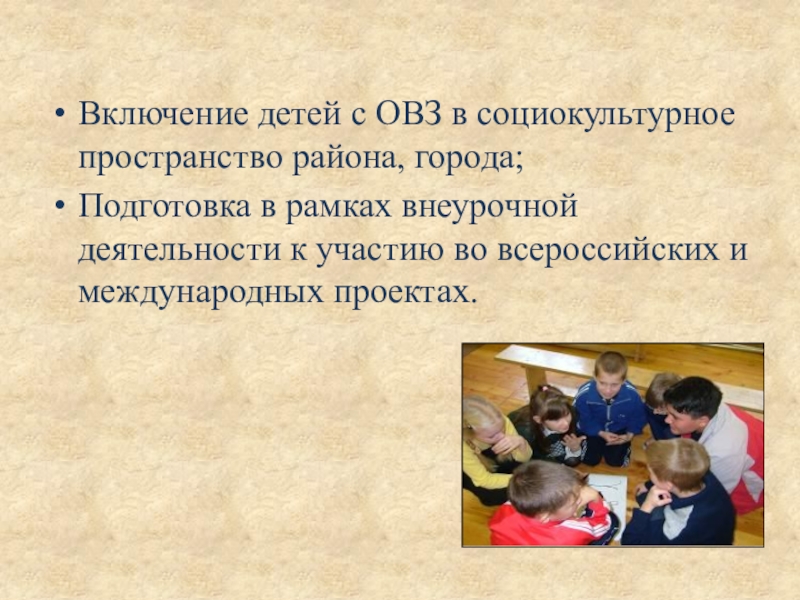 Слайд 9Включение детей с ОВЗ в социокультурное пространство района, города;