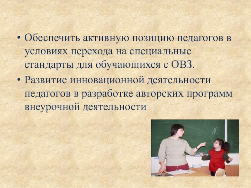 Слайд 11Обеспечить активную позицию педагогов в условиях перехода на специальные стандарты для