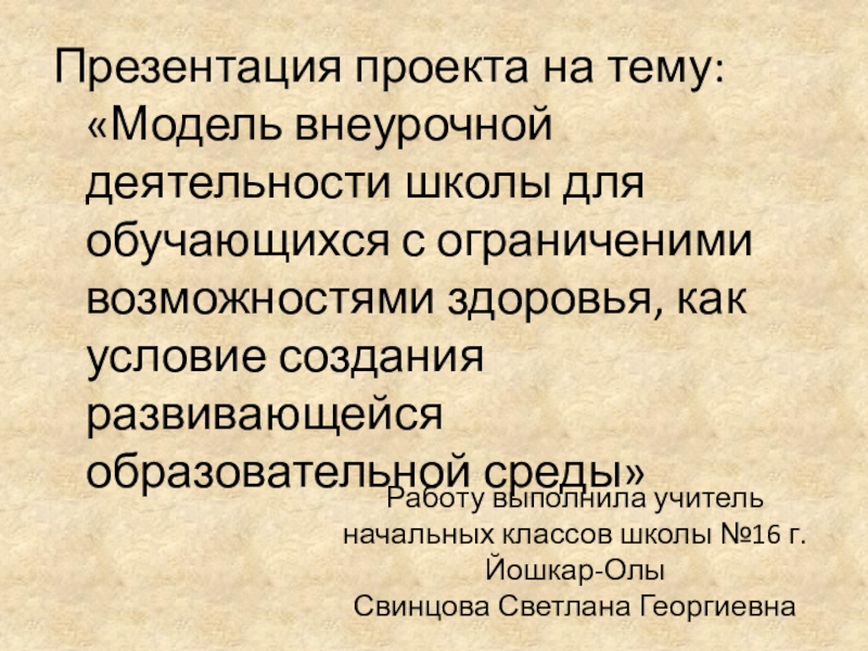 на тему: «Модель внеурочной деятельности школы для обучающихся с ограниченими возможностями здоровья, как условие создания развивающейся образовательной среды»
