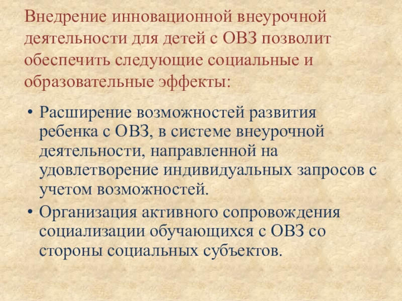 Слайд 8Внедрение инновационной внеурочной деятельности для детей с ОВЗ позволит обеспечить следующие