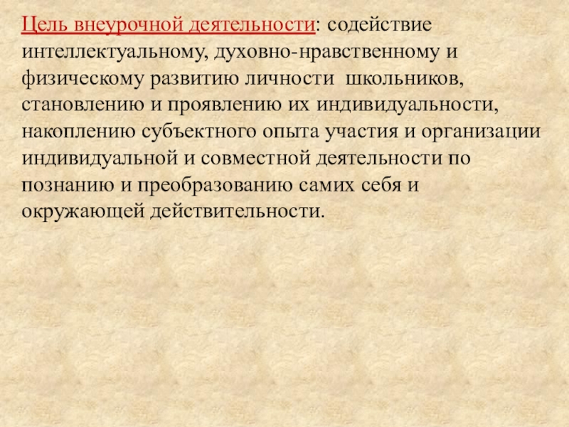 Слайд 13Цель внеурочной деятельности: содействие интеллектуальному, духовно-нравственному и физическому развитию личности школьников,