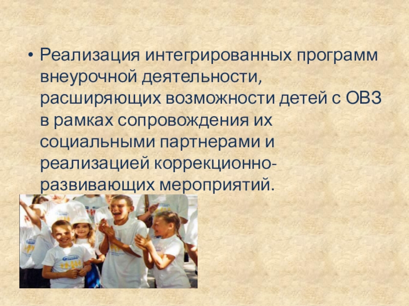 Слайд 10Реализация интегрированных программ внеурочной деятельности, расширяющих возможности детей с ОВЗ в