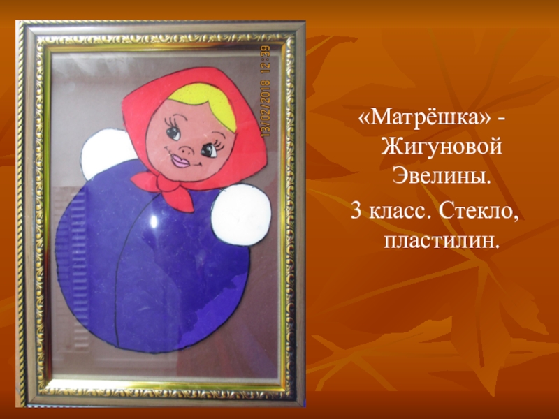 «Матрёшка» -Жигуновой Эвелины. 3 класс. Стекло, пластилин.