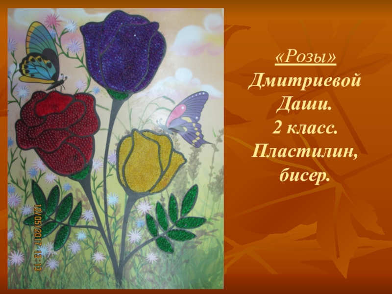 Слайд 1«Розы» Дмитриевой Даши. 2 класс. Пластилин, бисер.