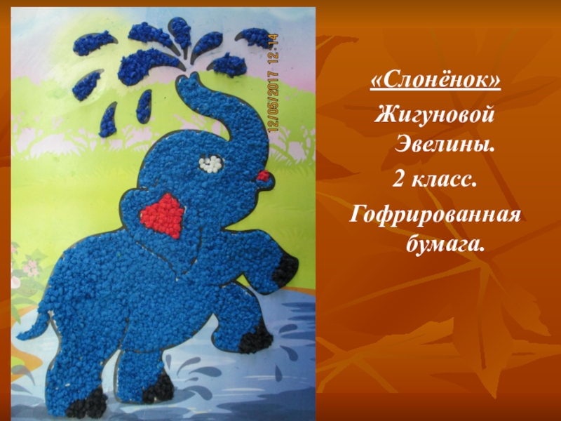 «Слонёнок»Жигуновой Эвелины.2 класс. Гофрированная бумага.