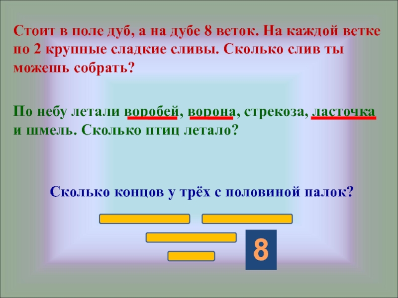 Слайд 7Стоит в поле дуб, а на дубе 8 веток. На каждой