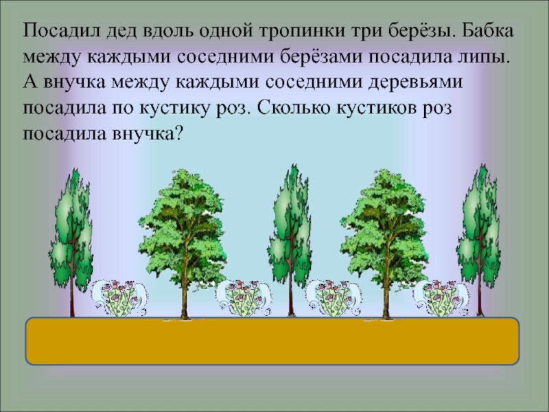 Слайд 8Посадил дед вдоль одной тропинки три берёзы. Бабка между каждыми соседними