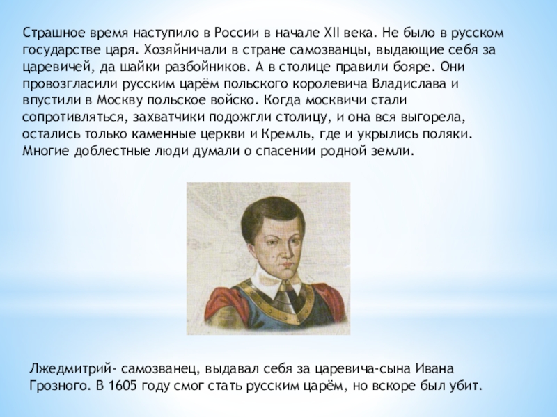 Лжедмитрий- самозванец, выдавал себя за царевича-сына Ивана Грозного. В 1605 году смог стать русским царём, но вскоре был убит.
