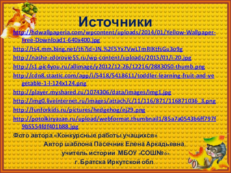Источникиhttp://hdwallpaperia.com/wpcontent/uploads/2014/01/Yellow-Wallpaper-Free-Download1-640x400.jpghttp://ts4.mm.bing.net/th?id=JN.%2F5Yx7VwLTmRIKtfsGu3o9ghttp://nashe-zdorovie55.ru/wp-content/uploads/2015/01/i-20.jpghttp://s1.pic4you.ru/allimage/y2012/12-26/12216/2883050-thumb.pnghttp://cdn8.staztic.com/app/i/5418/5418611/toddler-learning-fruit-and-vegetable-1-l-124x124.pnghttp://player.myshared.ru/1074306/data/images/img1.jpghttp://img0.liveinternet.ru/images/attach/c/11/116/871/116871036_3.pnghttp://funforkids.ru/pictures/hedgehog/ej29.pnghttp://potolkiryazan.ru/upload/webformat.thumbnail1/85a7a0543b6ff797f9b5554fdf401b88.jpgФото автора «Конкурсные работы учащихся»Автор шаблона Пасечник Елена Аркадьевна, учитель истории МБОУ «СОШ№6» г. Братска Иркутской обл.