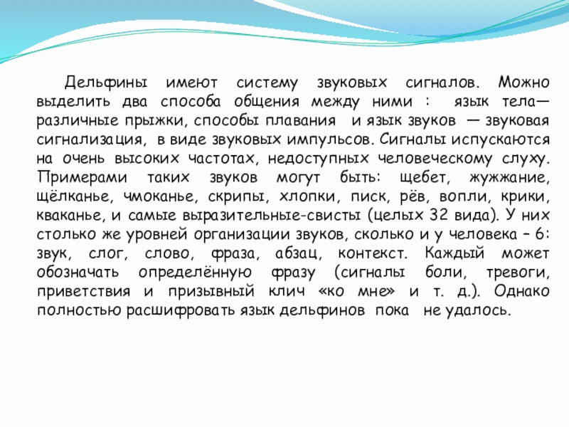 Слайд 17Дельфины имеют систему звуковых сигналов. Можно выделить два способа общения между