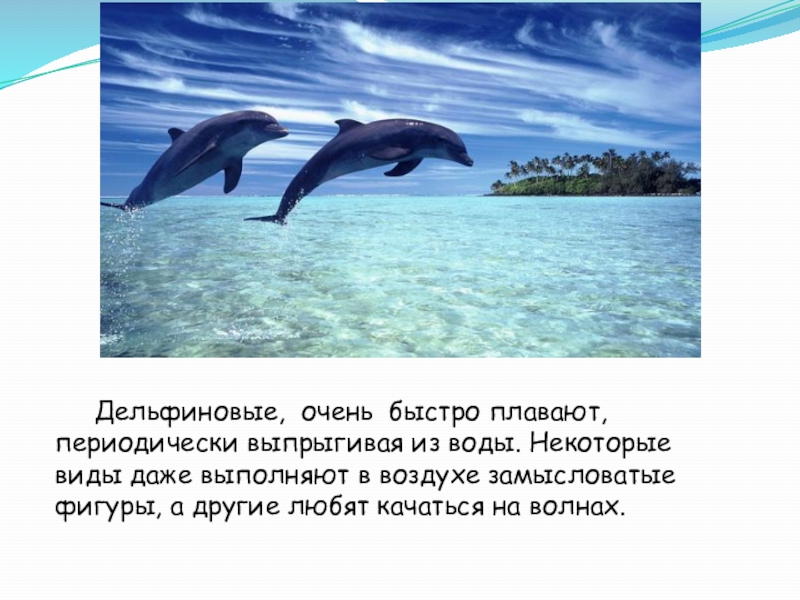 Слайд 11Дельфиновые, очень быстро плавают, периодически выпрыгивая из воды. Некоторые виды даже