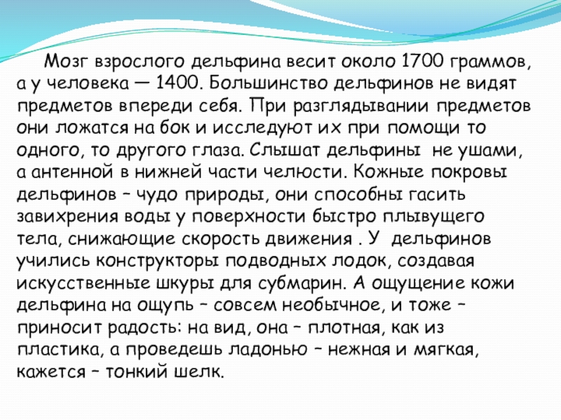 1400. Большинство дельфинов не видят предметов впереди себя. При разглядывании предметов они ложатся на бок и исследуют их при помощи то одного, то другого глаза. Слышат дельфины не ушами, а антенной в нижней части челюсти. Кожные покровы дельфинов – чудо природы, они способны гасить завихрения воды у поверхности быстро плывущего тела, снижающие скорость движения . У дельфинов учились конструкторы подводных лодок, создавая искусственные шкуры для субмарин. А ощущение кожи дельфина на ощупь – совсем необычное, и тоже – приносит радость: на вид, она – плотная, как из пластика, а проведешь ладонью – нежная и мягкая, кажется – тонкий шелк.