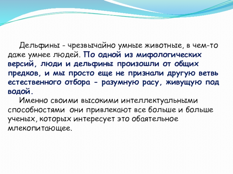 Слайд 4Дельфины - чрезвычайно умные животные, в чем-то даже умнее людей. По