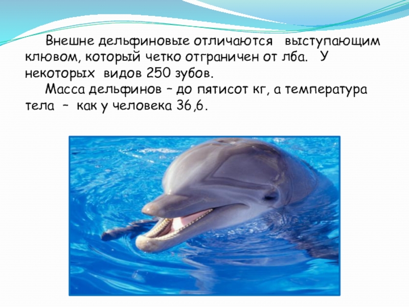 Масса дельфинов – до пятисот кг, а температура тела – как у человека 36,6.