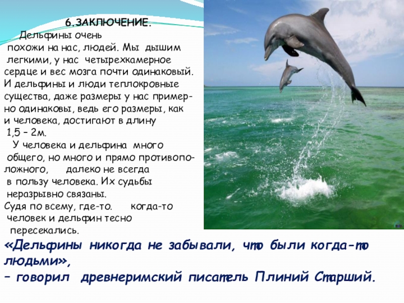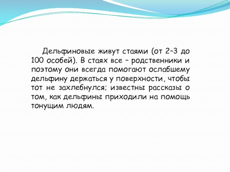 – родственники и поэтому они всегда помогают ослабшему дельфину держаться у поверхности, чтобы тот не захлебнулся; известны рассказы о том, как дельфины приходили на помощь тонущим людям.